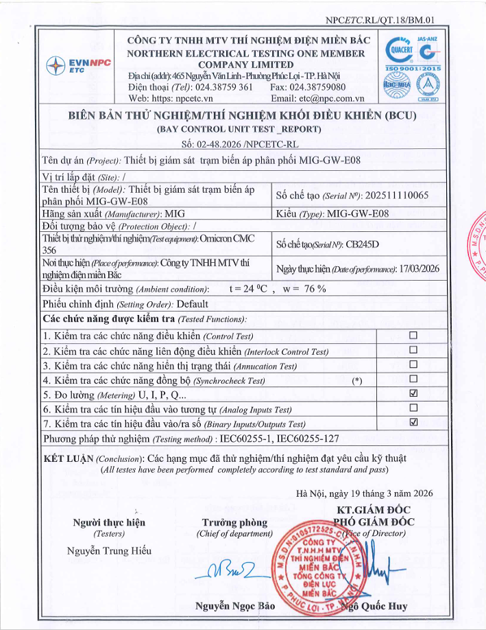 - Thiết bị giám sát trạm biến áp phân phối MIG-GW-E08 là giải pháp trọng tâm trong hệ thống quản lý trạm biến áp do MIG phát triển, hướng đến vận hành chủ động và an toàn cho lưới điện. Sản phẩm đảm nhiệm vai trò thu thập, xử lý và truyền nhận dữ liệu theo thời gian thực, giúp đơn vị vận hành theo dõi trạng thái thiết bị một cách chính xác và liên tục.